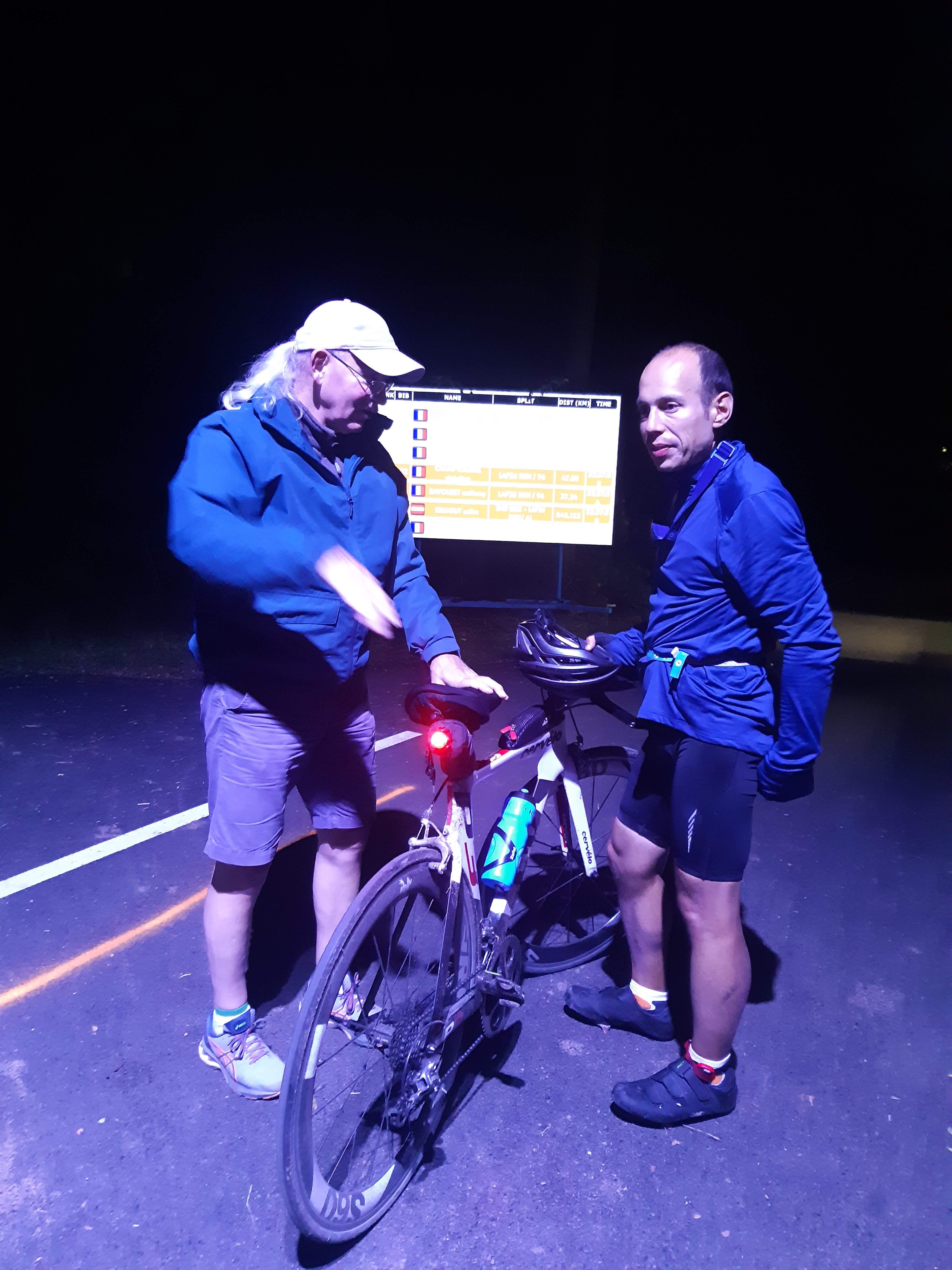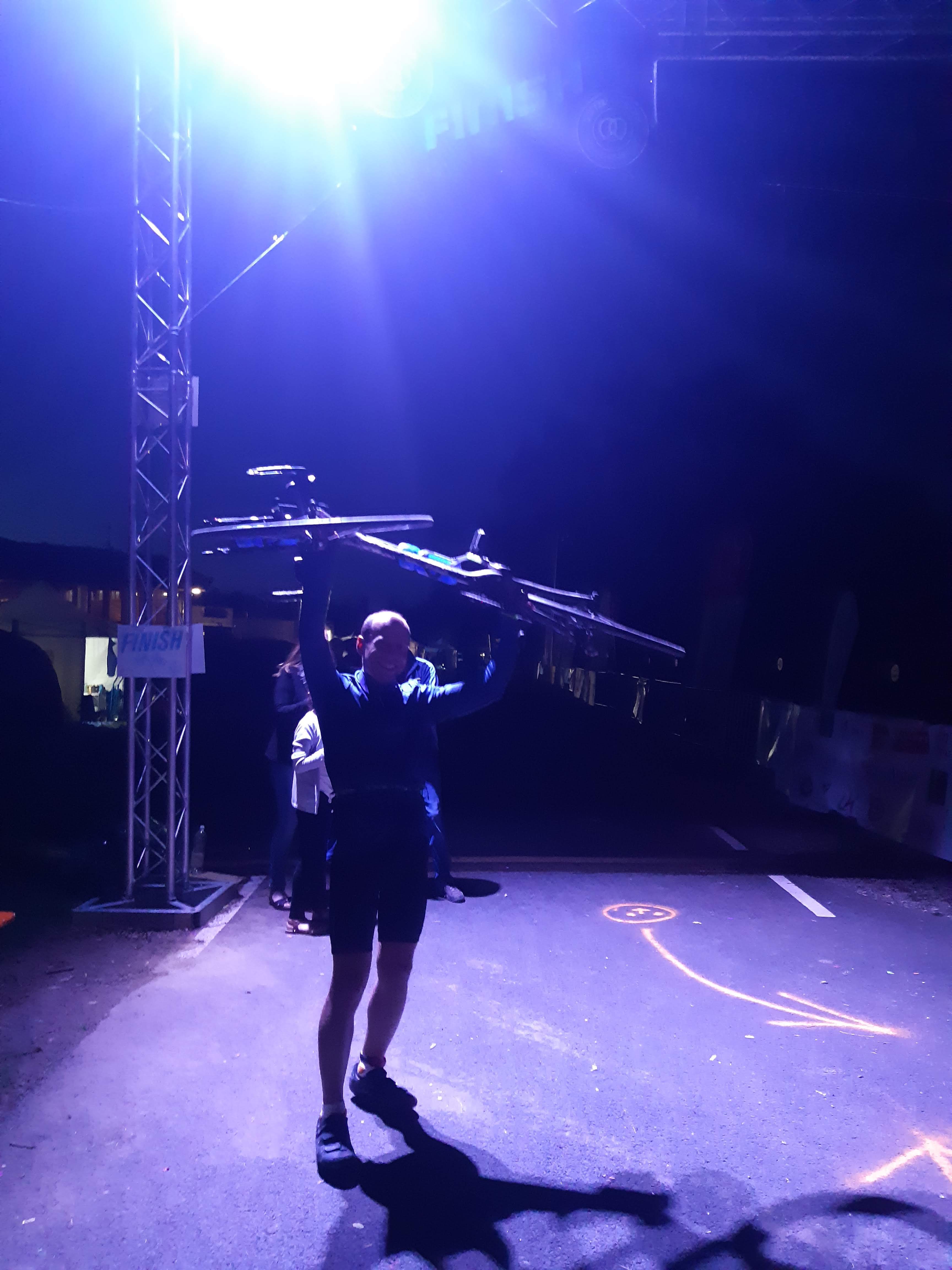 While waiting for my partner, I had found a better rhythm and was trying to ride as many laps as possible without getting off the bike. The longest break was probably the breakfast meal that morning. After she arrived I also put the new food into small plastic bags and ate it on the bike. I had the great fortune that my tires did not have a puncture during that night and the following day. In the end, it took me 27 hours to complete the 540 km. Finished the bike in the evening of friday, around 22:30 During the ride it was nice to encounter other athletes and exchange some quick words while passing each other.