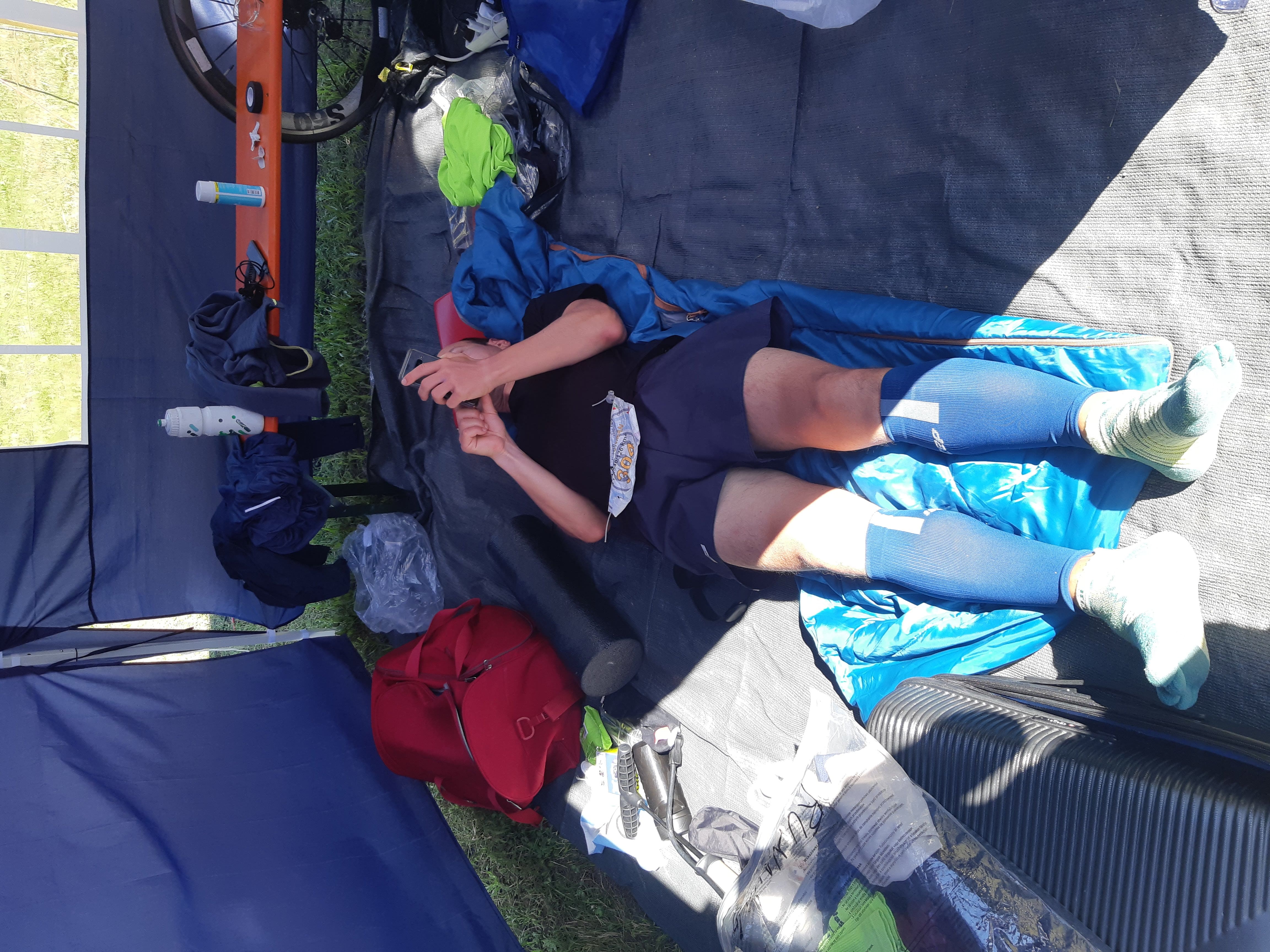 In the early morning hours I had only 4 gels and a few clif bars left. So I texted my partner around 7 or 8:00 to buy me some gels and bars and foot powder to keep my feet dry, as it was soaked during the night and definitely not ready to run when the time comes. She got in total 2 kilos of clif bars and 3 kilos of gels, don’t ask us why, it must have been the race excitement. I could probably survive, with that and the other food in the tent for a deca distance 😂